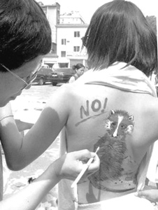 問(wèn)題是,如今的人體彩繪,已不滿足于在藝術(shù)殿堂里,而是在室外在大庭廣眾之下大行其道,其目的也不是要普及什么藝術(shù)文化,所圖的或許只有一個(gè)動(dòng)機(jī),那就是為商家推銷商品。這就值得認(rèn)真分析了。