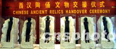十七日下午,美國國土安全部移民與海關(guān)執(zhí)法局的官員將六件西漢陶俑交送到中國駐紐約總領(lǐng)館,這六件神態(tài)各異的陶俑來自二00一年被盜的中國陜西西安西漢竇皇后墓,經(jīng)過中美兩國執(zhí)法部門一年多的合作終于在十七日歸還中國政府。