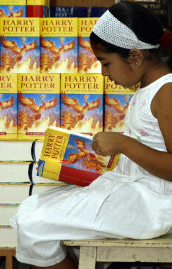 在全球書迷的引頸期盼下,風(fēng)靡世界的暢銷兒童讀物《哈利·波特》系列第五集《哈利·波特和鳳凰的指令》終于在格林尼治時(shí)間20日23時(shí)(北京時(shí)間21日上午7時(shí))全球同步發(fā)行。