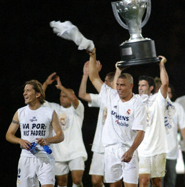 皇家馬德里隊必須贏得這場比賽才能確保贏得聯(lián)賽冠軍,為此全部精英首發(fā)上場,迎戰(zhàn)畢爾巴鄂隊。“外星人”羅納爾多當天還特意理了一個在去年世界杯賽期間理過的發(fā)式參賽,并在這場比賽中發(fā)揮得淋漓盡致,一人獨中兩元,為皇家馬德里隊奪取冠軍立下汗馬功勞。開場僅9分鐘,羅納爾多近射得手,使得皇家馬德里隊以1:0領(lǐng)先。第三十六分鐘時,畢爾巴鄂隊的阿爾基薩攻進一球,將比分扳成1:1平。上半場快結(jié)束時,巴西球星卡洛斯門前主罰任意球,將球直接踢進對方的球門。第六十一分鐘,羅納爾多錦上添花,將比分鎖定為3:1。