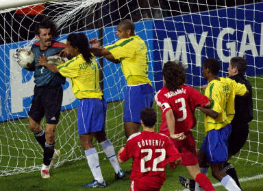 巴西隊(duì)開(kāi)場(chǎng)后占據(jù)優(yōu)勢(shì)。第23分鐘,盧西奧長(zhǎng)傳,阿德里亞諾突入禁區(qū),將球挑過(guò)魯斯圖的頭頂,巴西隊(duì)1比0領(lǐng)先。