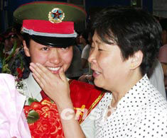 六月二十四日,完成北京小湯山戰(zhàn)地醫(yī)院抗擊非典任務(wù)的蘭州軍區(qū)白衣戰(zhàn)士凱旋。在蘭州車(chē)站,一位母親為女兒擦去激動(dòng)的淚水。 作者:楊曉波