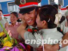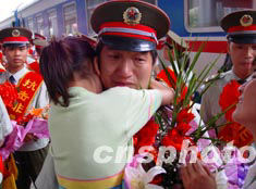 完成北京小湯山戰(zhàn)地醫(yī)院抗擊“非典”任務(wù)的蘭州軍區(qū)白衣戰(zhàn)士二十四日順利回到蘭州。在蘭州車(chē)站,一名軍醫(yī)與家人久別重逢,不禁熱淚盈眶。作者:杜洋
