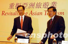 博鰲亞洲論壇秘書長(zhǎng)龍永圖(右)、香港財(cái)政司司長(zhǎng)梁錦松,六月二十六日在香港舉行記者會(huì),公布“新形勢(shì)下的國(guó)際旅游合作大會(huì)──重振亞洲旅游業(yè)”的詳情。該會(huì)議將于七月十四日至十五日在香港舉行。中新社記者 潘索菲