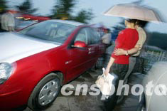 一對情侶二十七日晚在北京街頭冒雨觀看心儀的新款車型。由首都汽車股份公司主辦的汽車展示周活動二十七日晚在北京郡王府前的噴泉廣場揭幕。這是北京“雙解除”后,舉行的系列消夏活動之一。中新社記者:毛建軍