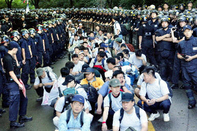 目擊者說,大約5400名鎮(zhèn)暴警員沖入漢城中部的延世大學(xué),當(dāng)時約有1500名鐵路工人在這所大學(xué)靜坐罷工。