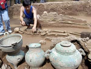 在發(fā)掘現(xiàn)場(chǎng)可以看到,遺址東南部寬7.3米、長9米以上的墓坑內(nèi),3具長1.6米左右的尸骨頭朝南方,整齊地?cái)[放在墓坑中央,臉部全部向東。陳祖軍告訴記者:“這些尸體的左臂卷曲在胸前,右手都是處于非正常狀態(tài),有的是小臂和大臂緊緊地貼在一起,有的肘關(guān)節(jié)已經(jīng)錯(cuò)位,所以這3具尸骨很可能是殉葬或者祭祀的犧牲品。在祭祀品下面可以隱約看見板狀的東西,可能是棺材。在厚約30厘米的土層下,可能埋有墓葬的主人。從出土器物的規(guī)格和數(shù)量來看,肯定墓葬主人是巴國的一位王侯!保牐