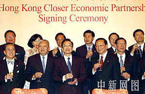 六月二十九日,在國(guó)務(wù)院總理溫家寶的見(jiàn)證下,商務(wù)部副部長(zhǎng)安民及香港特別行政區(qū)財(cái)政司長(zhǎng)梁錦松分別代表中央及香港在香港禮賓府簽署“香港與內(nèi)地更緊密經(jīng)貿(mào)關(guān)系安排”。中新社記者 潘索菲 攝