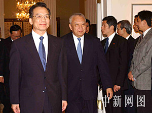 六月二十九日,國(guó)務(wù)院總理溫家寶在香港見(jiàn)證“內(nèi)地與香港更緊密經(jīng)貿(mào)關(guān)系安排”簽字儀式,圖為溫家寶在簽字儀式上向香港知名人士祝酒。中新社記者 潘索菲 攝