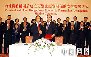 中國商務(wù)部副部長安民和香港財政司司長梁錦松,分別代表中央人民政府和香港特別行政區(qū)政府,在禮賓府舉行的簽署儀式上簽訂“安排”。