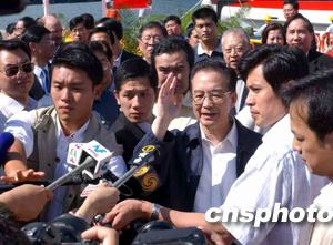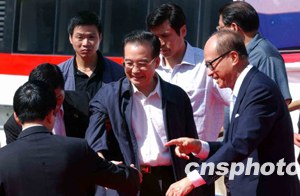 今天的葵涌碼頭一如往常一樣繁忙,人們?yōu)橛訙丶覍毜牡絹,鋪上了紅地毯,擺上了鮮花,掛起了歡迎的條幅。香港長實集團主席李嘉誠及副主席李澤鉅到碼頭迎候溫家寶一行。