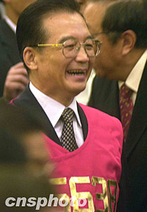 溫家寶甫走入會場,即向在場人士揮手致意,且和很多工作人員握手,還與一些工作人員親切交談,有工作人員要求和溫家寶合影,他也滿足了他們的要求。溫家寶穿上一件編號“6638”的紅色出市背心,這是一組喻意好運的數(shù)字。