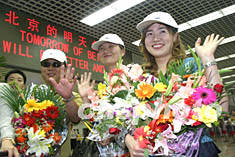 下午二時左右,當(dāng)六十名韓國游客走進(jìn)候機(jī)大廳時,早已在這里守候的歡迎人群立刻沸騰了起來。身著節(jié)日盛裝的姑娘們向來賓獻(xiàn)上鮮花和紀(jì)念品,歡迎來自韓國的勇敢的客人。