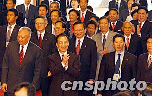 在樂聲、掌聲中,溫家寶等主要嘉賓在主席臺就坐。他的背後墻壁上懸掛著鮮艷的國旗和區(qū)旗。