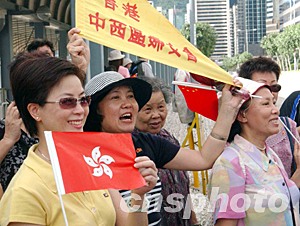 香港特區(qū)政府為慶;貧w祖國六周年,7月1日早上在灣仔金紫荊廣場舉行升旗禮,圖為參與觀禮的市民十分興奮。中新社記者 錢興強 攝