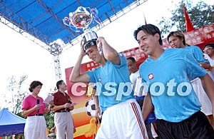 在香港慶;貧w祖國六周年足球嘉年華比賽中,獲得冠軍的香港漁民互助社足球隊興高彩烈上臺領獎。洪少葵 攝