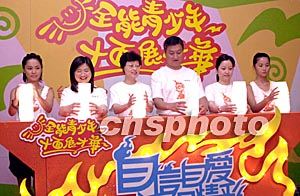 香港「2003年青少年暑期活動」7月2日舉行記者會,民政事務(wù)總署署長陳甘美華(左三)、與青少年暑期活動委員會主席陳振彬(左四)等人與活動大使Twins蔡卓妍(右一)及鍾欣桐(左一)攜手主持揭幕亮燈儀式。鄧慶樂 攝