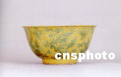 圖為明嘉靖黃地綠彩福祿壽紋碗,將松竹梅與福祿壽和云芝石融為一體,未見(jiàn)海內(nèi)外公私收藏著錄,估價(jià)四十五萬(wàn)元人民幣。中新社圖