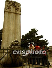 七月四日,中國北京明十三陵作為明清皇家陵寢的擴展項目被列入世界文化遺產名錄,一時吸引不少游人前來參觀。圖為游客對十三陵中定陵前的石碑產生濃厚興趣,明十三陵每處皇陵前都有類似烏龜馱石碑的石雕。中新社記者 宋吉河 攝