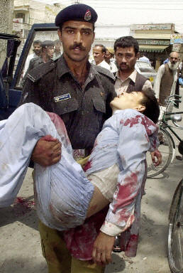 巴基斯坦西南部城市基達(dá)的一個(gè)什葉派穆斯林的清真寺內(nèi)4日發(fā)生自殺爆炸事件,至少15人死亡,數(shù)十人受傷。圖為巴基斯坦警察正在運(yùn)送受傷人員。