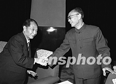 中國著名軍事家張愛萍上將,因病于七月五日二十時(shí)三十五分在北京逝世,享年九十三歲。圖為1984年4月30日晚,張愛萍(右)與胡耀邦在北京人民大會(huì)堂出席國防科工委慶祝試驗(yàn)通信衛(wèi)星發(fā)射成功大會(huì)上親切握手。作者:鄭瑞德