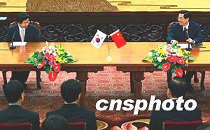 中國國家主席胡錦濤與韓國總統(tǒng)盧武鉉七日在北京共同出席雙方多個(gè)合作協(xié)議的簽字儀式。中新社記者:滿會(huì)喬