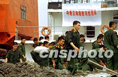 武警戰(zhàn)士八日在上海軌道四號線搶險現(xiàn)場加固臨時防護圍堰。上海昨日又降大雨,給沙堤內(nèi)側(cè)安置大型鋼制樁的施工還在緊張進行中,預計完成臨時防汛墻沿線約三百根鋼制樁的全部安置工作,還將持續(xù)一段時間。作者:劉殊瑾