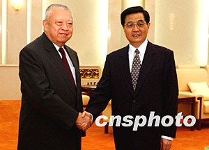 七月十九日下午在北京人民大會堂,中國國家主席胡錦濤握手歡迎香港特首董建華先生。中新社記者:賈國榮