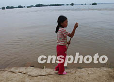 在七月淮河洪水圍困的安徽省穎上縣邱家湖泄洪區(qū)民堤上,一位農(nóng)家小姑娘在日漸垮塌的土堤上為家中察看水情。如果土堤被洪水沖垮,全村一千多人通往鄰村的唯一通道將被切斷。中新社記者:賈國榮