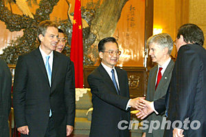 布萊爾表示完全贊同溫家寶對兩國關(guān)系的積極評價(jià)和對進(jìn)一步加強(qiáng)雙邊互利合作提出的建議。他說,英中之間有著廣泛的共同利益,在維護(hù)世界穩(wěn)定、促進(jìn)發(fā)展方面也有著共同的期待和追求。英方愿與中方攜手努力,不斷加強(qiáng)兩國在政治、經(jīng)貿(mào)、教育、文化等各領(lǐng)域的合作。