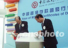 中國(guó)銀行(香港)21日在香港宣布推出四組港元及美元存款證,其中票面年息率最高為百分之三點(diǎn)四五。圖為該行副總裁林炎南(左)主持發(fā)行儀式。作者:裘之越