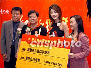 麥當(dāng)勞“搖滾薯條”形象代言人陳慧琳七月二十二日下午現(xiàn)身廣州,在海珠廣場麥當(dāng)勞分店參加了一系列的推廣活動。當(dāng)天廣東三元麥當(dāng)勞公司向陳慧琳兒童基金捐款十五萬元人民幣。作者:梁永強