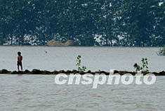 中國安徽省今夏發(fā)生近五十年最嚴(yán)重的淮河洪水,前兩次洪峰因及時分洪而去,但第三次洪峰正在形成。圖為穎上縣的洪水與行洪區(qū)連成一片,土堤上的孩子和小狗處境堪憂。中新社記者:賈國榮