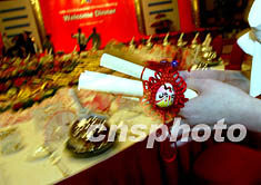 二十三日晚舉行的第五屆亞歐經(jīng)濟部長會議歡迎晚宴上,用富有中國民族特色的京劇臉譜包扎的菜譜成為不少外賓的收藏品。中新社記者:鄭萍萍