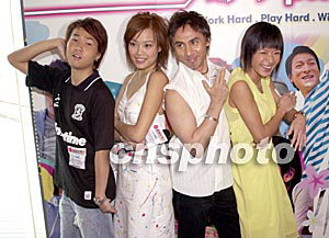 新城電臺(tái)廣播劇《都市情色》7月24日在香港舉行記者會(huì)。該劇部份演出歌星盧巧音、黃凱芹、容祖兒、葉文輝(右起)出席宣傳活動(dòng),四人于會(huì)上擺弄姿勢(shì)搞笑一番合照。作者:鄧慶樂(lè)