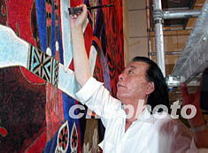 二十五日,旅美華裔畫(huà)家丁紹光經(jīng)過(guò)五天五夜補(bǔ)畫(huà)完畢上海大劇院巨幅名畫(huà)《藝術(shù)女神》。作者:湯彥俊
