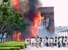 一個風(fēng)和日麗的日子里,M國駐廣州領(lǐng)事館門前人們在悠閑地交談、漫步,突然,轟隆一聲巨響,只見領(lǐng)事館窗口濃煙滾滾,頃刻大火蔓延,驚慌的人們四散逃開,哭聲、喊聲、呼救聲夾雜一片,一些民眾則被困在領(lǐng)事館的天臺顯得非常無助……
