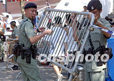七月三十一日香港出售“皇馬”球賽門票,由于購買球票的球迷眾多,警察在香港大球場加強(qiáng)治安警戒。中新社記者:錢興強(qiáng)