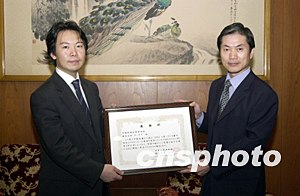 由中國新聞社日本分社與日本新秦公司聯(lián)合發(fā)起的防治“非典”網(wǎng)上募捐活動日前結(jié)束,南起沖繩,北至北海道,日本民眾、團體及在日華僑華人踴躍捐資,五十七萬日元捐款8月1日送交中國駐日大使館,請其轉(zhuǎn)交中國有關(guān)部門。圖為中國駐日使館李文亮參贊向新秦社長端木正和授予感謝狀,并請他轉(zhuǎn)達對各位捐款者的衷心感謝。中新社記者:陶光雄