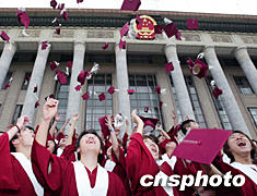 北京中加學(xué)校2003畢業(yè)典禮八月二日在北京人民大會(huì)堂舉行,三百一十一名高中學(xué)生及三十六名BTM、IHM專業(yè)的學(xué)生畢業(yè),高中畢業(yè)學(xué)生報(bào)考外國(guó)大學(xué)的升學(xué)率達(dá)到百分之百。圖為畢業(yè)的學(xué)生們?cè)谌嗣翊髸?huì)堂外歡呼慶祝。中新社記者:毛建軍