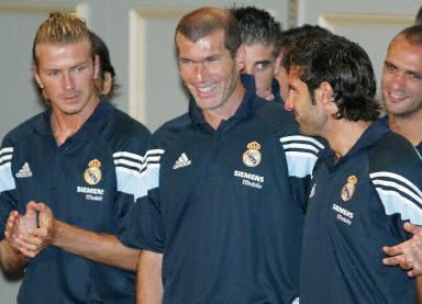 當(dāng)?shù)貢r(shí)間8月4日上午,日本方面為皇馬舉行了隆重的歡迎儀式,圖為貝克漢姆和齊達(dá)內(nèi)等在發(fā)布會(huì)上。