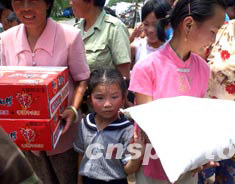 圖:高溫中的淮河災(zāi)民獲得軍方捐贈(zèng)食品