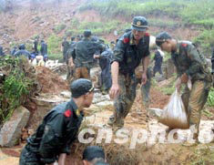 受熱帶風(fēng)暴“莫拉克”影響,8月5日凌晨6時(shí)許,福建晉江市磁灶鎮(zhèn)東山水庫一外圍堤壩出現(xiàn)20米長的決口,由于水庫與下游農(nóng)田有約20米的落差,下游的3個(gè)村莊、1萬多人口、1000余畝農(nóng)田因此受到嚴(yán)重威脅。二千多軍民經(jīng)過5個(gè)多小時(shí)的搶險(xiǎn)奮戰(zhàn),終于堵住決口。作者:徐承彬