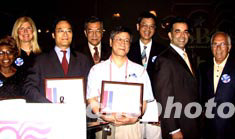 華裔小商業(yè)八月五日成為紐約納斯達(dá)克交易所的明星,四名華裔商家在這里受到美國聯(lián)邦中小企業(yè)管理局的表彰。圖為美國聯(lián)邦中小企業(yè)管理局局長赫克托·巴雷特(右二)向獲獎?wù)哳C獎。作者:趙海燕