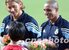 著名球星菲戈、齊達(dá)內(nèi)、羅納爾多、貝克漢姆、卡洛斯、勞爾等,向熱情的球迷揮手致意。他們?cè)诖筇猛A袅思s十分鐘,然后乘車前往下塌的灣仔君悅酒店。酒店外亦有大批球迷守候。