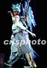 中國中央芭蕾舞團新版《大紅燈籠高高掛》夢幻舞中的女學生熱戀京劇武生趙子龍的夢幻雙人舞,音樂和編舞更具浪漫情結。中新社記者:賈國榮
