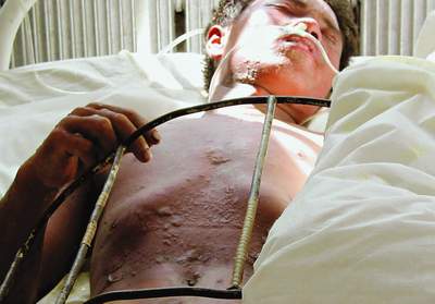 8月6日上午,解放軍307醫(yī)院黃韶卿教授、沈陽軍區(qū)醫(yī)研所所長王繼群、解放軍321醫(yī)院燒傷科主任周長軒、解放軍307醫(yī)院急救中心主任王漢斌博士等先后來到齊齊哈爾,對中毒人員進(jìn)行了進(jìn)一步確診。據(jù)203醫(yī)院院長孫景海介紹,芥子氣中毒臨床癥狀為三期:休克期、感染期和骨髓抑制期,目前,31名中毒患者已度過休克期,醫(yī)院正全力以赴使處感染期的患者得到救治。