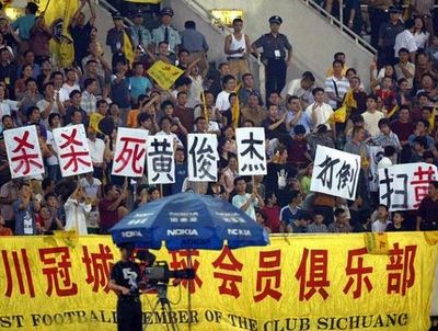 昨日京川之戰(zhàn)的上座率并不高,但球迷的怒氣卻能創(chuàng)下成體之最。比賽第4分鐘,鄒侑根被對方防守隊員拉倒,裁判未判點球,“黑哨”的聲音頓時響起。第43分鐘,現(xiàn)代隊安德烈將比分改寫為1∶0,部分球迷認(rèn)為這個進球有越位嫌疑。上半場結(jié)束后,黃俊杰到冠城會員區(qū)附近撿球,馬上引起看臺上一片騷動,小旗桿、廢紙團冰雹般往黃俊杰身上扔。在回休息室的路上,黃俊杰再次遭到“襲擊”,裝滿水的礦泉水瓶“砰”的砸在球員通道上,記者還能看到里面的人影應(yīng)聲躲閃。下半場開始后,新的標(biāo)語牌在球迷區(qū)舉起,“殺殺殺死黃俊杰”,顯得觸目驚心,部分球迷甚至喊起了帶有人身攻擊的不文明口號。汪嵩的進球被判為越位后,助理裁判朱宏慶也成了被攻擊對象,2區(qū)的球迷齊齊豎起中指,一邊高喊:“邊裁,小心得‘非典’!”