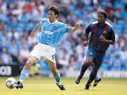 這是曼城備戰(zhàn)新賽季英超的最后一場比賽,同時也是曼徹斯特大球場的揭幕戰(zhàn),因此,主教練基岡格外重視。孫繼海首發(fā)出場擔(dān)任右后衛(wèi),他的身后是門將西曼。而他面對的是剛剛轉(zhuǎn)會巴塞羅那隊(duì)的小羅納爾多的進(jìn)攻。第5分鐘,奧維馬斯帶球突破菲利普斯后獲得很好的機(jī)會,孫繼海上前封堵,逼得奧維馬斯傳球出界。雖然對手實(shí)力很強(qiáng),但在主場作戰(zhàn)的曼城仍與對手展開對攻。孫繼海與菲利普斯這邊的進(jìn)攻明顯要比左路活躍。第34分鐘曼城首先打破僵局,貝爾科維奇中路得球后轉(zhuǎn)身快速突破,雷茨格爾慌亂中將球誤傳給阿內(nèi)爾卡,法國人門前右腳推射破門。上半場曼城一球領(lǐng)先巴塞羅那。