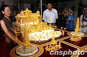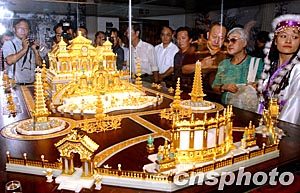 八月十二日,價值2.33億元人民幣的“金玉圓明園大水法”落戶圓明園,開始為期一年的展示活動。這一足金全寶石微縮工藝景觀以圓明園為大背景,由大水法、觀水法、遠瀛樓三組建筑組成,經(jīng)數(shù)十位工藝美術(shù)大師用五年時間精心設(shè)計、創(chuàng)制完成,實用瑞士千足黃金60公斤、新疆和田玉100余公斤、鉆石2333粒、藍寶石649粒、紅寶石142粒、祖母綠29粒、翡翠205件、海水珍珠582粒、木座選用緬甸百年花梨木1.5噸制成,以再現(xiàn)當(dāng)年西洋樓大水法的輝煌與不凡。中新社記者:武仲林